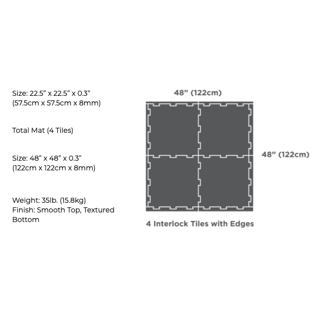 You’ll love these tough, long-lasting, environmentally friendly workout mats. Re-vulcanized, non-porous, slip-resistant and easily cleaned. This 4-sided interlocking mat is easy to install and maintain. Our mats provide great value and multiple options for your recreational flooring requirements. Flexible enough to be used in a variety of multipurpose applications such as home gyms, workshops, garages, basements as well as many commercial applications.