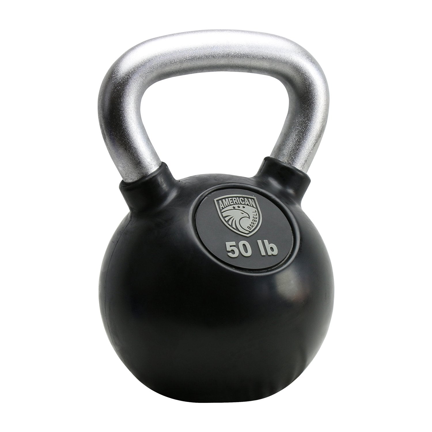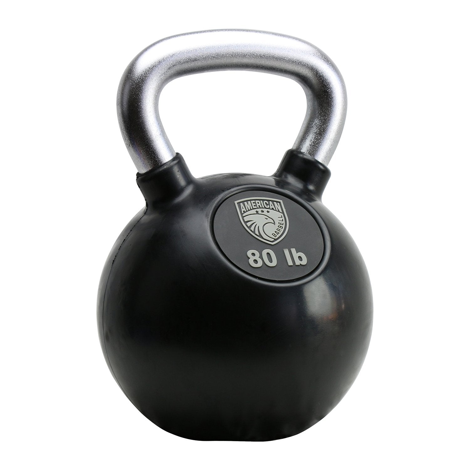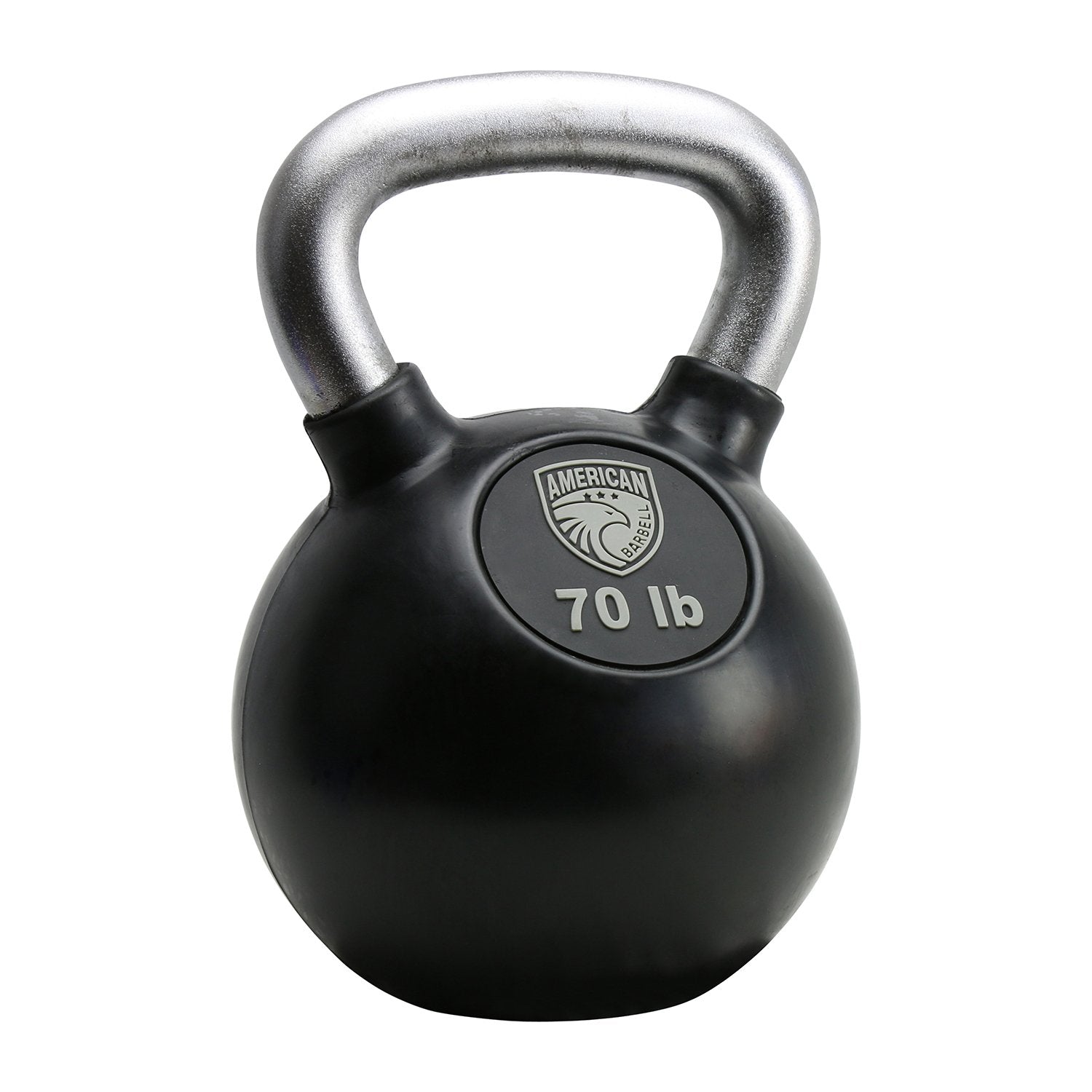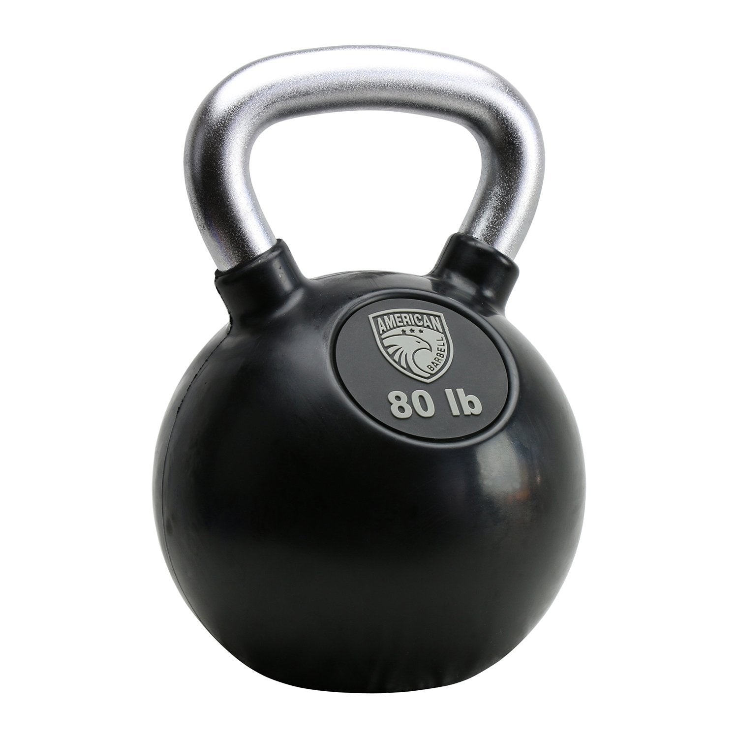 The American Barbell rubber coated cast iron kettlebell is well balanced with a smooth chrome handle and ergonomic grip. Its rubber coating helps prevent chipping and damage, making these a solid choice for any training environment. Available from 5-80LBs.
