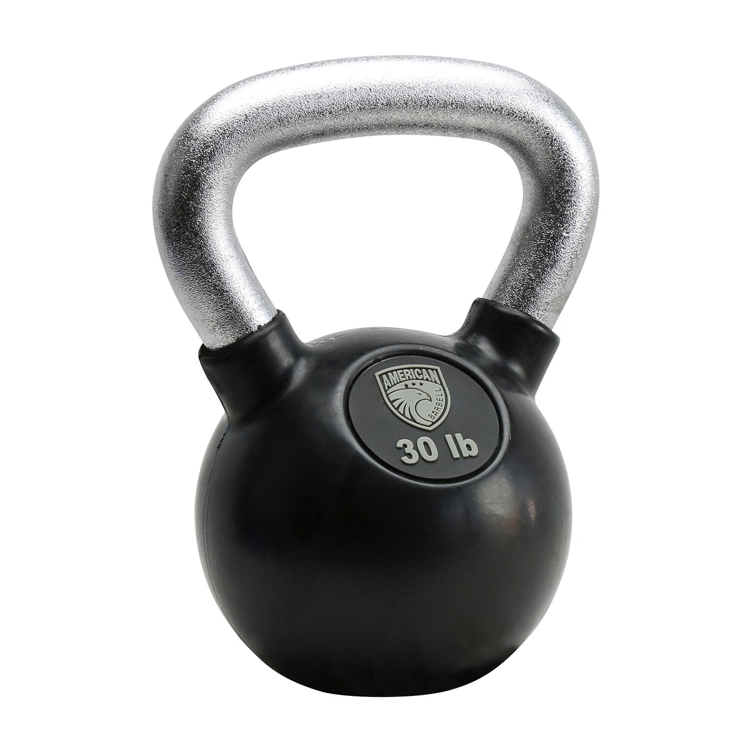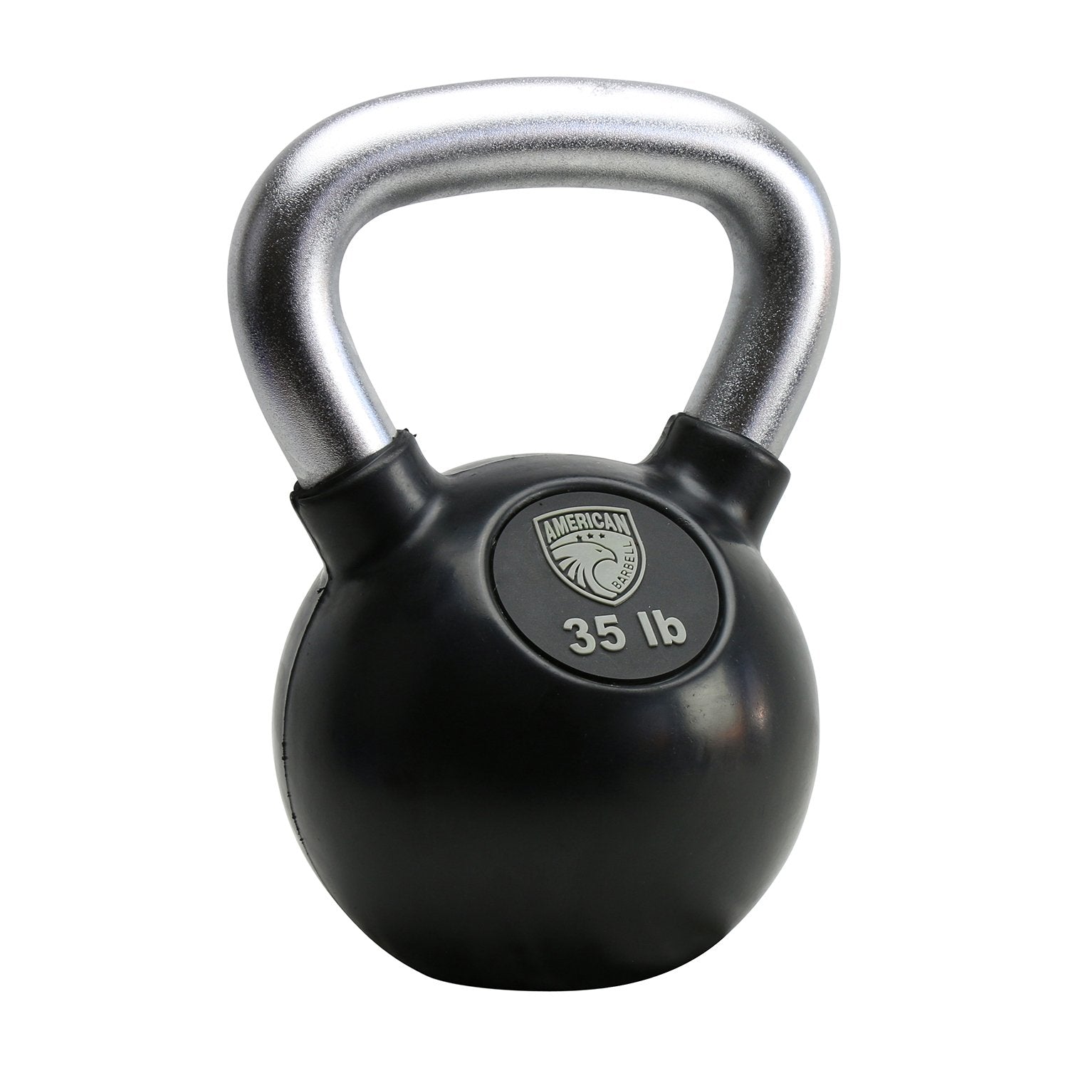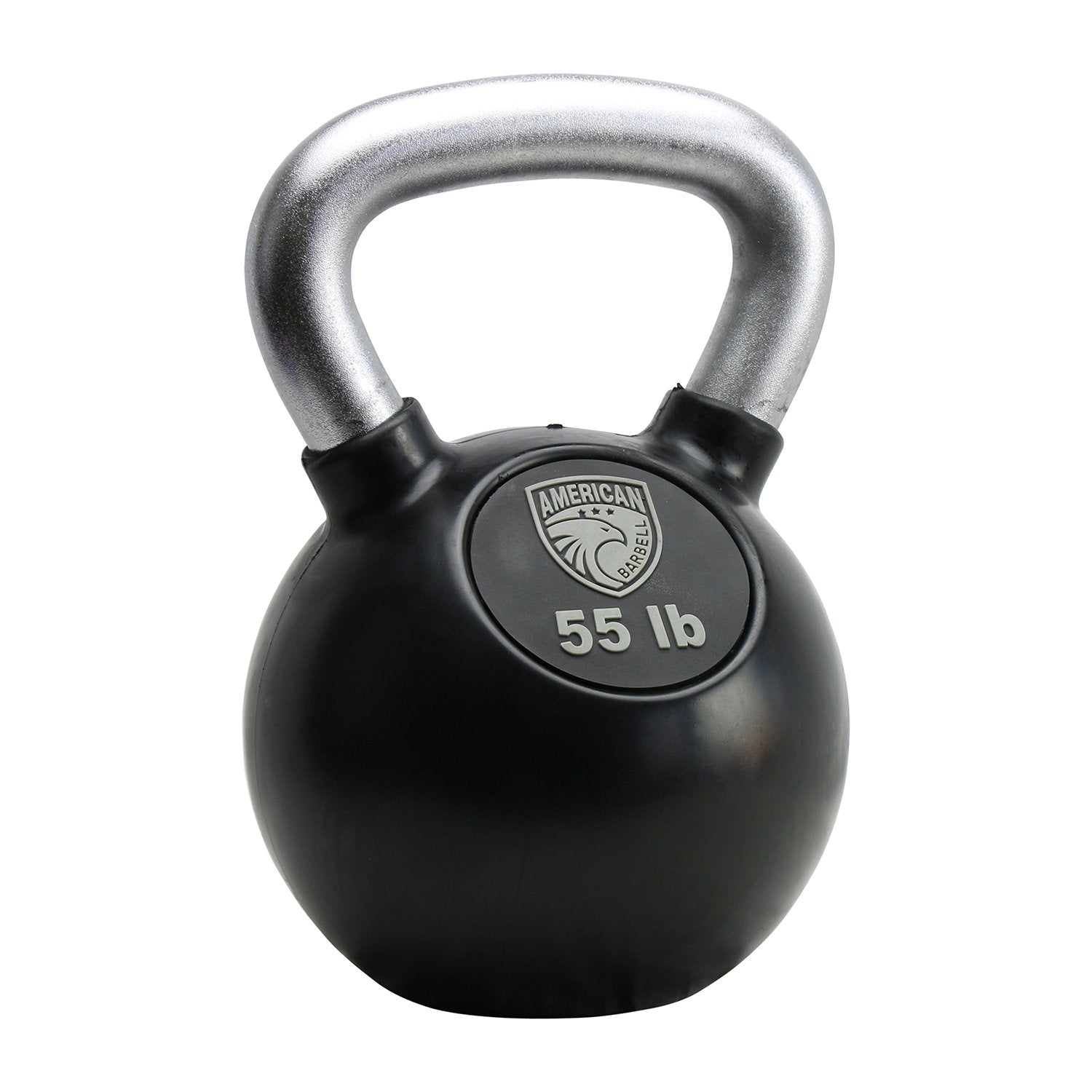 The American Barbell rubber coated cast iron kettlebell is well balanced with a smooth chrome handle and ergonomic grip. Its rubber coating helps prevent chipping and damage, making these a solid choice for any training environment. Available from 5-80LBs.
